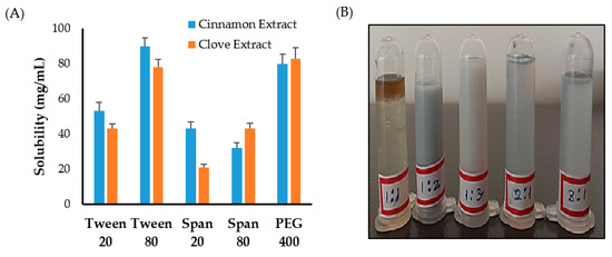 First, solubility studies of clove and cinnamon extracts were conducted in different surfactants and co-surfactants to select the appropriate surfactant/co-surfactant (Smix) mixture to be used for emulsification process. As shown in Figure 1A, maximum solubility of clove and cinnamon extracts was observed in Tween 80 and PEG 400 compared to other systems containing Tween 20, Span 20, or Span 80. Accordingly, a surfactant/co-surfactant (Smix) mixture composing of Tween 80 and PEG 400 was selected for further emulsification processes.