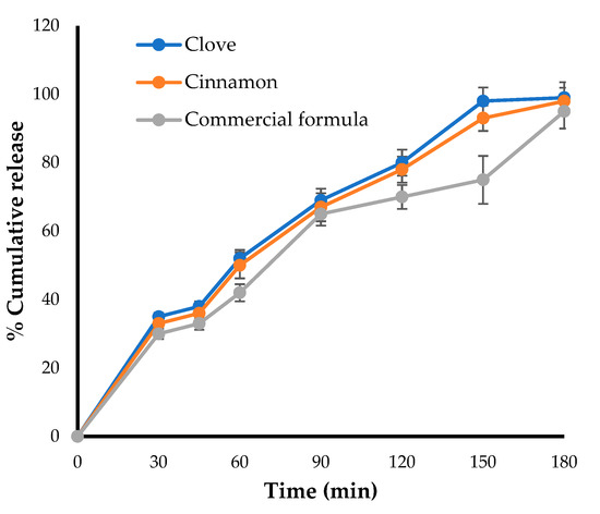 The in-vitro release pattern was carried out for the optimized formulation and was compared with that of a marketed preparation using Franz diffusion cell. As shown in Figure 4, the amount of drugs (clove and cinnamon) released from the optimized formula was comparable to the amount of clotrimazole released from the marketed gel formulation, with about 50% of the loaded drug released within 50 min. In addition, nearly 100% of loaded drugs were released from both formulae after 180 min, suggesting the efficient release of clove and cinnamon extracts from the optimized formula and nullifying the possible detrimental effect of gel-forming polymer on drug release from emulgel formulation.
