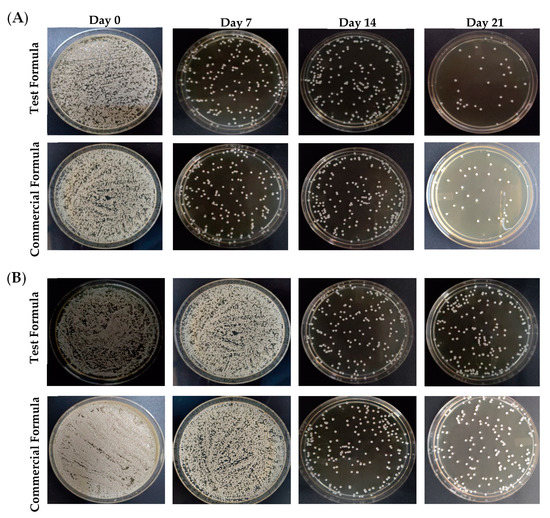 Mean fungal growth reduction (CFU/ mL) from the (A) palatal surface and (B) denture surface upon treatment with either test formula or a commercially available gel on days 0, 7, 14, and 21 post treatment.