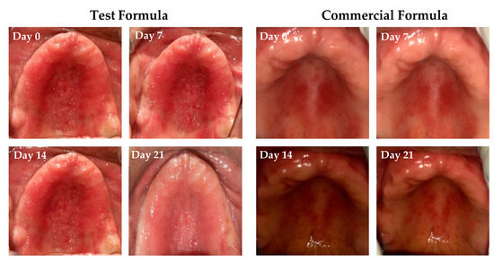The response to treatment with either clove/cinnamon extracts-loaded emulgel or the commercially available gel (Candid®) in patients suffering from denture stomatitis was evaluated clinically. As depicted in Figure 6, treatment with optimized emulgel formula significantly enhanced the clinical outcomes in patients suffering from denture stomatitis as manifested by a remarkable improvement in erythema of palatal mucosa. In addition, as summarized in Table 6, treatment with optimized test formula significantly alleviated denture stomatitis-related inflammation, compared to Candid®-treated group, in a treatment duration-dependent manner. The complete cure rate percentage in patients treated with the optimized formula increased from 19% on day 7 post treatment to 47.6% on day 21 post treatment. Most importantly, there was a remarkable shift from Newton’s stages II/III denture stomatitis to Newton’s stage I denture stomatitis, and no patients suffering from either Newton’s stage II/III denture stomatitis were observed on day 21 post treatment. On the other hand, more than 20% of Candid®-treated group still suffered from Newton’s stage II denture stomatitis even following three weeks’ treatment. These results emphasized that the optimized emulgel formula could provide superior clinical remission of Newton’s classification and reduction of fungal burden compared to the commercially tested gel (Candid®). Chi-square test was conducted for test and control groups to evaluate the influence of applied treatment on clinical improvement and found statistically significant improvement in test group when compared to the control group (Table S4).