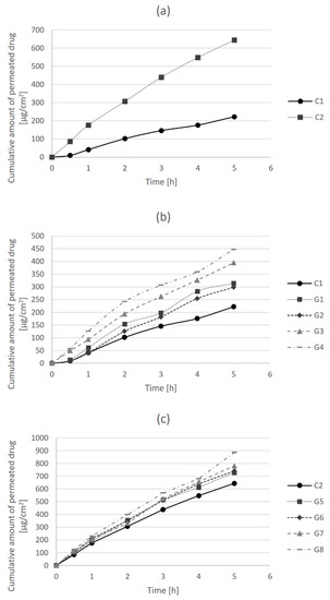 In Figure 1a, it can be observed that the release of clindamycin and its permeation across the membrane over time was higher in the control hydrogel formulation with carmellose sodium (C2) than in the carbomer control gel (C1). Figure 1b shows the differences in the release and permeation of clindamycin in carbomer hydrogel formulations (C1 and G1–G4). The permeability of clindamycin increased with the addition of bile acids, particularly after the addition of cholic acid in a higher concentration (G4). Similarly, the permeability of clindamycin in carmellose sodium gels increased with the addition of bile acids (Figure 1c). It was more pronounced after the addition of cholic acid (G7, G8) than deoxycholic acid (G5, G6), and slightly more after the addition of cholic acid at a higher concentration (G8) in comparison to a lower concentration (G7).
