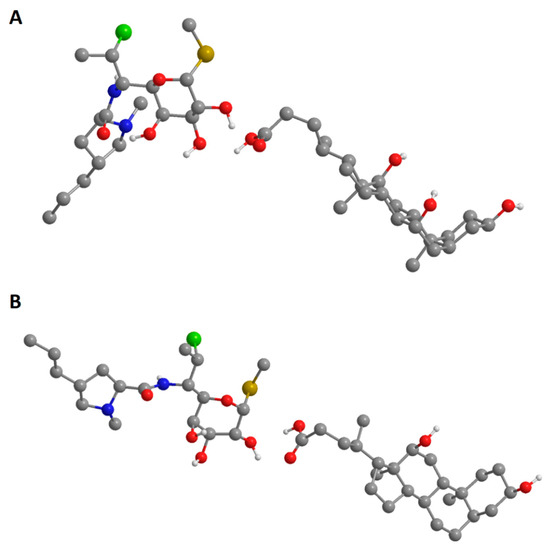 Geometrically optimized three-dimensional structures of clindamycin/cholic acid (A) and clindamycin/deoxycholic acid (B) complexes.
