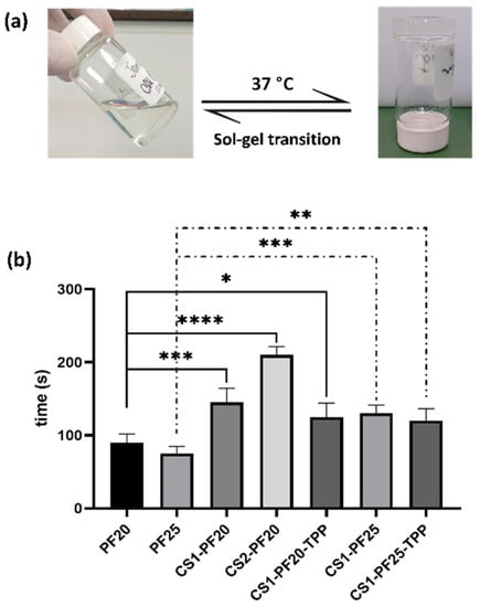 The sol–gel transition characteristics of a thermosensitive gel: (a) Phase changes with a temperature increase. (b) Gelation time of CS-PF hydrogels containing different CS and PF concentrations, with and without TPP. Values represent mean ± SD (n = 5). All experiments were performed five times. (Ordinary one-way ANOVA, * p < 0.05, ** p < 0.01, *** p < 0.001 and **** p < 0.0001).