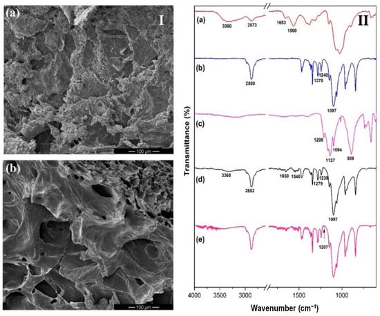 (I) SEM micrographs of freeze-dried hydrogels, CS1-PF25 (a) and CS-PF-TPP (b). (II) FTIR spectra of CS (a), PF 127 (b), TPP (c), CS-PF hydrogel, and CS-PF-TPP hydrogel ((d,e), respectively).
