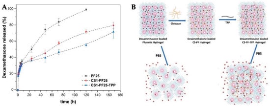 As it frequently happens in delivery systems, an initial burst was observed during the first 8 h of the study in which approximately 35% of the occluded dexamethasone was released both in the pluronic and CS-PF mixed hydrogels. These results are common, as the drug closer to the surface can escape more easily in contact with the surrounding fluid due to the rapid interaction. Furthermore, in this particular case, the released drug is highly soluble and has a low molecular weight, which further favors the release. From this time onwards, a difference between the amount of dexamethasone released from the PF hydrogel and from the prepared CS-PF hydrogels is observed. In the PF hydrogel, the release occurs mainly due to the disentangled rate of the micelles that leads to a dissolution of the gel. The drug is left free in the PBS solution [59]. The decrease in the release of dexamethasone from CS1-PF25 and CS1-PF25-TPP hydrogels was due to the reduction of the diffusion rate of the micellar aggregates of PF trapped within the compartments of the chitosan networks [20]. As was also expected, in the sample crosslinked with TPP, the release was lower due to the fact that the interlaced chitosan chains managed to retain even the micellar aggregates of PF. The swelling processes are reduced, and therefore, the release of dexamethasone is even more controlled. In the scheme shown in Figure 4B, we represent graphically how the release process can be modified according to the composition of the hydrogels under study.