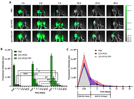 However, in the samples treated with the hydrogels, a prolonged fluorescence was observed, which gradually decreased over time and could even be seen slightly after 35 days. In the intensity graph (Figure 5B), the reduction in fluorescence that occurs over time is observed in more detail. With the CS1-PF25-TPP hydrogel, the intensity was reduced more slowly over time even compared to non-crosslinked hydrogel.