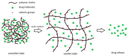 However, due to the abnormal glucose metabolism, the surrounding environment of the tumor is acidic [57,58]. Therefore, cationic polymers containing basic groups such as –NH2 prove more useful for the drug delivery in cancer treatment [54,56]. Once the pH is lower than the dissociation constant, pKa, these pendent groups will protonate as suggested by Henderson–Hasselbalch equation [59,60,61]. As a result, the positively charged polymer chains exhibit electrostatic repulsion against each other to stretch the polymeric network and allow more free space for water migration [61,62]. The basic strength of those side groups and polymeric molecules is definitely a crucial factor to consider the swelling behavior of the hydrogels in the acidic environment [59,60]. Owing to the presence of the charged ions in the network, osmotic pressure also facilitates the water to move into the hydrogel for swelling [61]. The swelling process finally equilibrates with the re-coiling force of the polymer chains, which is closely associated with the polymer elasticity and crosslinking densities [55]. Figure 2 briefly demonstrates the swelling process of a cationic polymer hydrogels in acidic environment.