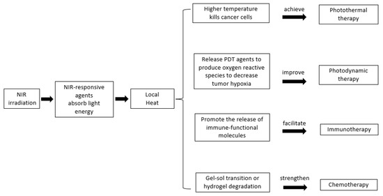 An increasing number of research works show great interest in the application of combinational therapies to realize an enhanced therapeutic efficacy. Two or more therapeutic strategies are integrated into one smart hydrogel system to exert cancer-killing effects [9,11,35]. Some exciting achievements include combined photothermal and photodynamic therapy [11,24], combined photothermal and chemotherapy [63], or combined photothermal and immunotherapy [18]. These combinational cancer treatment approaches contain photo-responsive agents which absorb near infrared (NIR) light to generate heat. The heat generation initiated a series of effects including local hyperthermia, immune response, production of oxygen reactive species, and elevated drug release, as shown in Figure 3. All of these have positive effects on killing cancer cells [9]. Gold nanoparticles [64], indocyanine green [65], reduced graphene oxide [66], iron-oxide [67,68], MoS2 [35], CuS [69], and black phosphorus quantum dots [36] have been reported as photo-responsive agents.