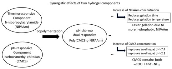 NIPAAm can also be grafted onto carboxymethyl chitosan (CMCS) to form poly(CMCS-g-NIPAAm). Both NIPAAm and CMCS contents in the overall hydrogel system played a role in adjusting the gelation temperature and gelation time. Increasing the NIPAAm concentration decreased both sol–gel transition temperature and gelation time whereas the increase in CMCS content rose the gelation temperature and prolonged gelling time [43]. It was also important to note that CMCS resulted in the increase in swelling ratio of the hydrogel in both pH = 2.1 and pH = 7.4. This was attributed to CMCS being amphoteric containing both –COOH and –NH2 groups. 5-Fluorouracil was loaded to the hydrogel for breast cancer line; MCF-7, and its release rate was elevated by reducing the temperature from 37 °C to 25 °C and decreasing the pH from 7.4 to 2.1 [43]. Figure 4 has been drawn by the authors of the present review to illustrate the synergistic effect of this co-polymer. Instead of performing co-polymerization, chitosan, sodium-glycerophosphate and hyaluronic acid can be directly mixed to form injectable and dual responsive hydrogels. The addition of hyaluronic acid was reported to not only improve the mechanical properties of the chitosan (hydrogen bond formation) but also to reduce the burst release. Hydrogen bonding was formed between the carboxyl group of hyaluronic acid and protonated amines of chitosan to give a mechanically stronger network which in turn reduced the burst drug release of chitosan alone hydrogel (over 90% of DOX released during 20 h) [10]. All these examples discussed here indicate the synergistic effect between the components of the overall hydrogel system.