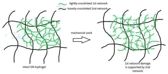In DN hydrogel, the damage in the tightly crosslinked 1st network is supported by the loosely-crosslinked 2nd network, thus exhibiting no catastrophic failure of the overall DN hydrogel system.