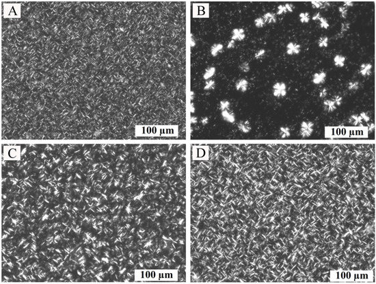 The microstructure of oleogels was studied to assess the effect of the type of oil medium on the morphology of the crystals. The morphology and size of crystals formed in oleogels affect the structural characteristics of the oleogels and, subsequently, the food products containing them [24,25]. The morphology of crystals of oleogels obtained with different oils was determined using polarized light microscopy.