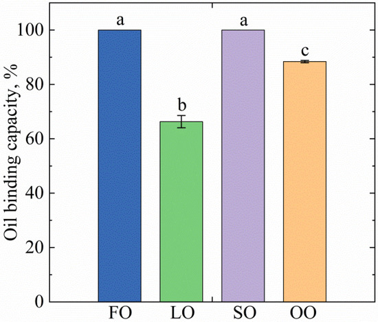 Oil-binding capacity of oleogels based on different oils: FO—fish oil, LO—linseed oil, SO—sunflower oil, OO—olive oil. The same letter indicates no significant difference (p < 0.01).