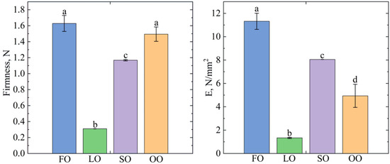 As the same structure-forming agent, beeswax, was used for all the samples, the differences in textural properties could be caused by the variety of fatty acid composition of the oils used as the dispersion medium. According to [33], if the hardness can be measured for all samples, it shows that they have solid-like properties. The results (Figure 3) showed that the hardness for the FO samples is (1.63 N ± 0.11 N), slightly lower for the OO (1.49 N ± 0.10 N) and SO samples (1.17 N ± 0.01 N), and lowest for the LO sample (0.31 N ± 0.01 N). According to [33], high hardness values are considered to be a desirable property of oleogel, as it allows the use of less structuring agents to achieve rheological characteristics similar to solid fats without significantly affecting the sensory characteristics of the product. Young’s modulus values differed slightly, with the highest value for oleogel FO (11.31 N/mm2 ± 0.69 N/mm2), similarly to hardness, and the lowest value for oleogel LO (1.33 N/mm2 ± 0.05 N/mm2). The high hardness values but low elastic modulus values of the OO sample indicate that the sample is similar in hardness to oleogel FO, but less elastic.