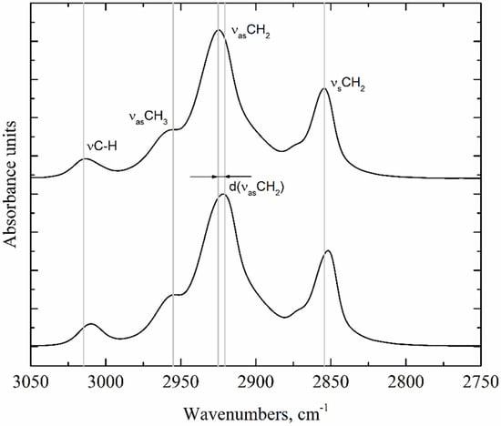 Statistically significant shifts were found only for the C-H stretching vibration of alkenes (νC-H) absorption bands at 3005–3011 cm−1, CH3 asymmetric stretching vibration (νasCH3) at 2953 cm−1, CH2 asymmetric stretching vibration (νasCH2) at 2920–2925 cm−1, and CH2 symmetric stretching vibration (νsCH2) at 2851–2854 cm−1 (Figure 5) [37]. The absence of significant changes in the absorption bands of polar groups indicates that their vibrations are not sensitive to any conformational change in the oleogelation by beeswax. The positions of the absorption bands for the studied samples are given in (Table 4) and correspond to the expected positions of the absorption bands for lipids.