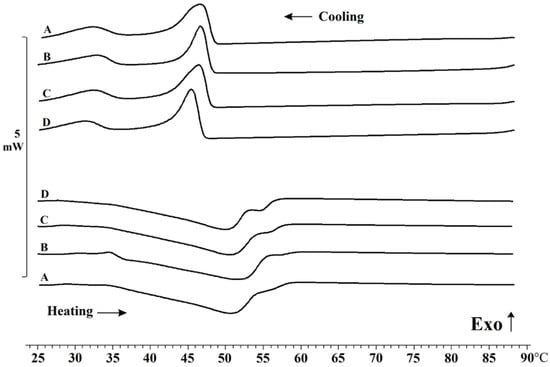Heating and cooling thermograms of the oleogels (A—fish oil gel, B—linseed oil gel, C—sunflower oil gel, D—olive oil gel).