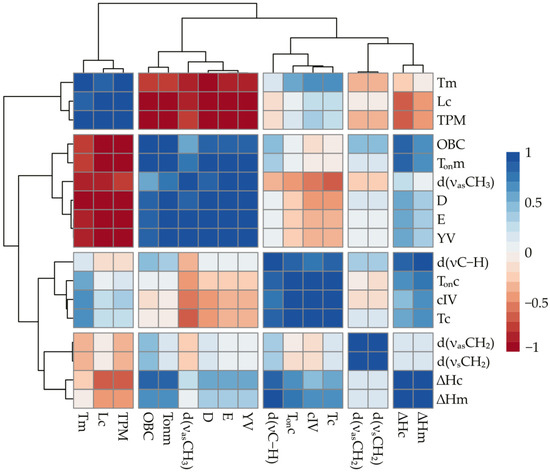 Correlation analysis of the data was carried out to summarize the obtained data and identify common patterns for beeswax oleogels based on various edible oils, and a heatmap was constructed for all the obtained values. Figure 7 shows that the studied indicators can be divided into several groups depending on their correlation coefficient.