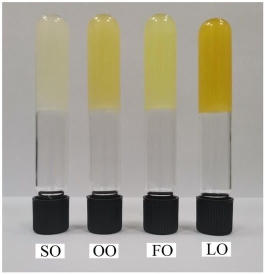 According to the classification described in [34] and the obtained YV values (Table 3), the texture of the three oleogel samples based on FO, SO, and OO can be classified as “satisfactory plastic and spreadable” and the LO oleogels as “very soft, not spreadable.” In particular, this characteristic can be useful when selecting oleogels to replace solid fat in food products, taking into account the individual characteristics of the end product. When analyzing the results of microscopy, where the average crystal length decreases in the series LO > SO > OO > FO, and hardness values, the oleogels with smaller crystals form stronger gels, which also confirms the conclusion put forward in [35] about the influence of crystal size on the textural properties of oleogels. In our opinion, this pattern may be related to the larger surface area in small crystals. Probably, certain fatty acids or polar components present in oils influence the morphological features of crystals, thereby changing the textural properties of oleogels. For example, work [36] indicates a significant influence of polar components on the structure of the oleogel network, which in turn leads to significant changes in the properties of oleogels, including textural properties. It is worth noting that, despite the differences in the hardness of oleogels, they can all be recommended as a substitute for solid fats, as shortenings and margarine with different textural properties can be used in the composition of food products.