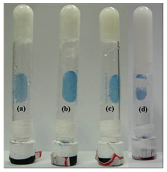 Digital photos of inverted bottle (length = 10 cm and inner dia. = 1 cm) of hydrogel, (a) MEM:TPCA = 1:1, (b) MM:TPCA = 1:1, (c) MM:BTA = 1:1 and (d) MM:CHTA = 1:1.