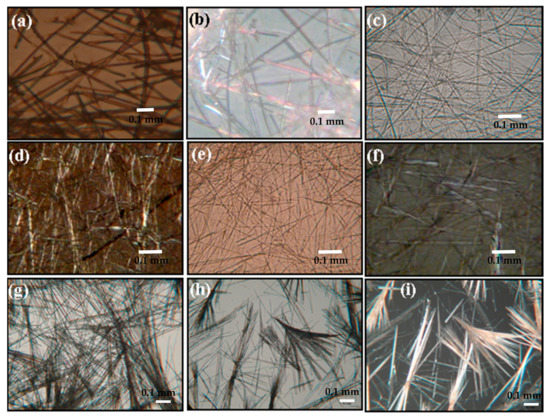 The microstructures of the supramolecular hydrogels have been investigated by optical microscopy and FESEM. Most interestingly, the molecular structure and the ratio of the two components have a pronounced effect on the formation of microscopic structure and macroscopic properties of the hydrogel. As seen from Figure 2, all sets of hydrogels produce long fibers which lead to the formation of intermolecular hydrogen–bonded three–dimensional scaffolds [18,19,20,22,49]. Exceptional results have been observed for MM:CHTA 1:1 and it shows one-dimensional crystal–like morphology along with the presence of a gel fibrillar network. Owing to the small size of the crystal, diffraction is not possible. FESEM images show that there are dramatic changes in morphology on tuning the ratio of the two components as well as molecular structure. MEM:TPCA gels in all compositions reveal tubular morphology having a diameter more than 1 µm (Figure 3a,b). MM–TPCA gel gives a fibrous network structure of a width in the range of 100–200 nm (Figure 3c). For a MM-BTA gel system, interesting results have been obtained by varying the ratio of the two components. As observed from Figure 3d, MM:BTA in a molar ratio of 1:1 shows a rod-like structure. When the content of triamine is increased (MM:BTA 3:1), however, long belts having a width of ~5 µm are the main motifs (Figure 3e) produced in the hydrogel. Similarly, if the molar ratio of triacid (BTA) is increased, a belt-like morphology is a dominant feature. For all molar ratios, MM–CHTA gel systems produce a mixture of belt and rhombohedral crystal-like structure having a width in the order of micrometer (Figure 3f). HRTEM images resemble the similar observations for the hydrogel systems (Figure S3).