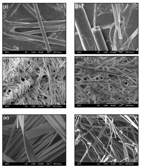 FESEM images of (a,b) MEM:TPCA 1:1, (c) MM:TPCA 1:1, (d) MM:BTA 1:1, (e) MM:BTA 3:1 and (f) MM:CHTA 1:1.