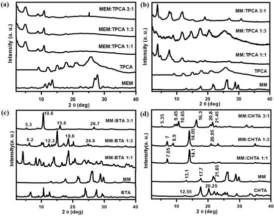 XRD patterns of (a) MEM–TPCA, (b) MM–TPCA, (c) MM–BTA and (d) MM–CHTA dried network prepared from the respective hydrogel at three different molar ratios and individual moieties (MM, MEM, TPCA, BTA and CHTA).