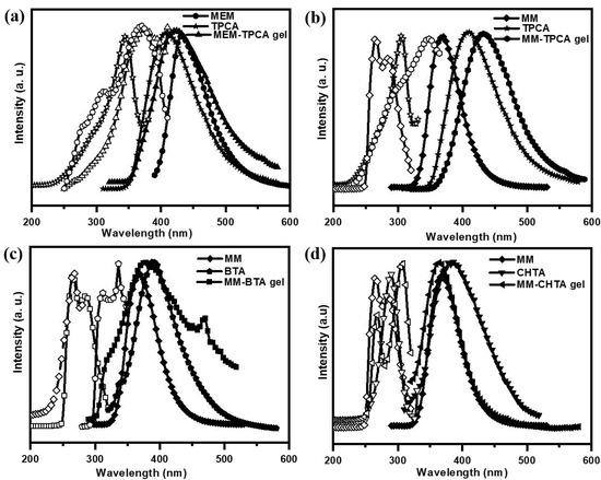 Fluorescence excitation and emission spectra of (a) MEMTPCA, (b) MM–TPCA, (c) MM–BTA and (d) MM–CHTA hydrogel network (1:1) and individual moieties (MM, MEM, TPCA, BTA and CHTA).