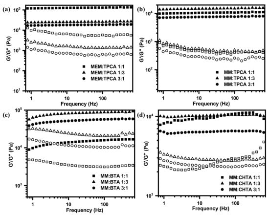 Frequency sweep of (a) MEM–TPCA, (b) MM–TPCA, (c) MM–BTA and (d) MM–CHTA hydrogel networks at three different molar ratios.