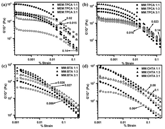 Strain sweep of (a) MEM–TPCA, (b) MM–TPCA, (c) MM–BTA and (d) MM–CHTA hydrogel networks at three different molar ratios.