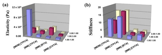 Bar diagram of values of (a) Elasticity and (b) Stiffness of the hydrogel networks of four systems at three different molar ratios.