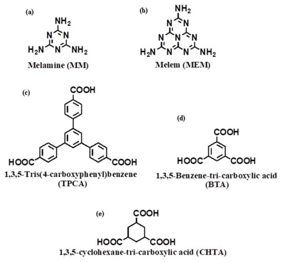 Melamine is an excellent building block for constructing well-designed functional supramolecular self-assemblies because of its rigid and planar structure together with multiple hydrogen bonding and π–π stacking ability [19,20,21,22,23]. Melamine produces a very nice hydrogen-bonded rosette motif, the CA-M (CA, Cyanuric Acid and M, Melamine) adduct that is certainly the best studied. Whitesides and co-workers investigated in detail the self-assembly of cyanuric acid and melamine into the respective rosette structures [24]. By employing s-triazine molecules with sterically bulky substituents or allowing preorganization of building units by interconnecting them with a hub linker, the formation of rosettes can be favored over the formation of tapes [25,26]. The 1,3,5-triazine ring motif (s-triazine, C3N3) has shown extensive utility in synthetic chemistry [27], coordination chemistry [28,29], and optical and magnetic studies [30,31]. Over the last decade, s-triazine played a key role in molecular routes to generate carbon nitride (CNx) materials investigated by many groups [32,33,34]. These s-heptazine and cyameluric ring structures were first postulated as a component of the polymer melon, [-C6N7(NH2)-NH-]n, by Pauling and Sturdivant in 1937 [35]. However, the crystal structure of molecular s-heptazine C6N7H3 was first solved by Leonard et al. in 1982 [36]. It has been realized that thermal condensation of melamine is the most convenient route to prepare s-heptazine units. The cyameluric nucleus (C6N7), which is the structural pattern of the heptazine core, is present in melem and melon. Heptazine units are also the building blocks of graphitic g-C3N4 [37,38,39,40]. The study of carbon nitride-type compounds has become an attractive field, as these units offer several advantages of the higher thermal and chemical stability, catalytic behaviors and semiconducting properties. As a result, scientists or technologists have realized the potential of these units for numerous applications [41,42,43,44]. In some cases, melamine or its derivatives could form supramolecular hydrogels [45] or organogels [46], a class of robust functional soft materials which have received considerable recent attention, integrating one or several imide components due to the ability of formation of triple hydrogen bonding. However, owing to the major problem of solubility, self-assembly study of melem in water is rarely reported [47,48]. Herein, we have rationally picked up two triamines melamine (MM) as well as melem (MEM) and three tricarboxylic acids (TPCA: 1,3,5-tris(4-carboxyphenyl)benzene, BTA: 1,3,5-benzene tricarboxylic acid, and CHTA: 1,3,5-cyclohexane tricarboxylic acid) for the gelation study in which all have C3 symmetric functional groups (Scheme 1). and we have also explored that not only symmetrical position of complementary interactions but also recognition of site and size are crucial for the creation of one-dimensional self-assembled fibrils that eventually lead to the formation of gelation in aqueous medium.