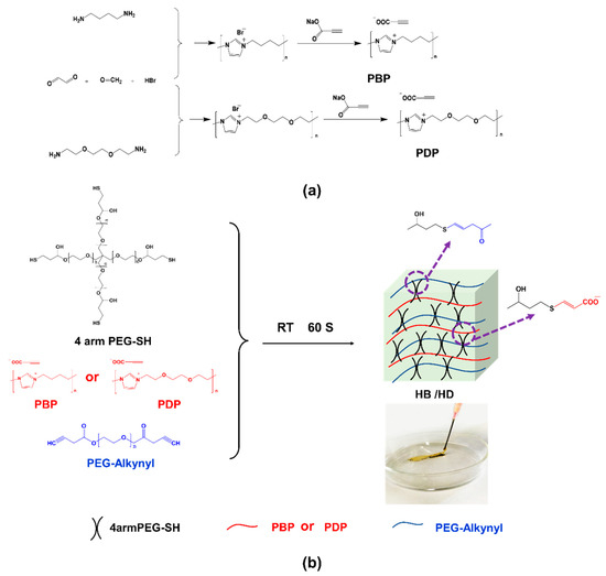 Firstly, two antibacterial imidazolium PILs, namely poly(N-butylimidazolium propiolic acid (PBP) and poly(N-(3,6-dioxaoctane) imidazolium propiolic acid) (PDP)), were obtained via polycondensation reaction (Figure 1a) [25]. The synthesized imidazolium PILs containing alkynyl and biocompatible poly(ethylene glycol) (PEG) propiolate (PEG-Alkynyl) were crosslinked with 4 arm thiol PEG (4 arm PEG-SH) to fabricate fast gelation and injectable antibacterial hydrogels by thiol-yne click reaction (Figure 1b). The 4 arm PEG-SH played the role of the backbone here, combining imidazolium PILs and PEG-Alkynyl, and the molecular weight was about 20,000, which demonstrated good crosslinking efficiency [26].
