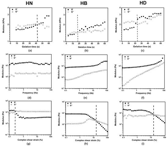 The gelation time (a–c) at a constant frequency (f = 1 Hz); frequency sweep (d–f) with constant oscillatory strain (γ = 0.5%) and f = 0.1–100 Hz; amplitude sweep (g–i) with f = 1 Hz and γ = 0.1–100%.
