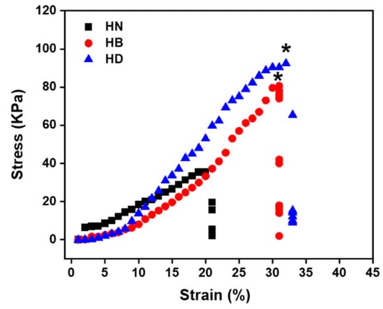 Stress–strain curves for the compressive testing at 25 °C of HN, HB and HD after freeze-drying (n = 4, * means p ≤ 0.5).