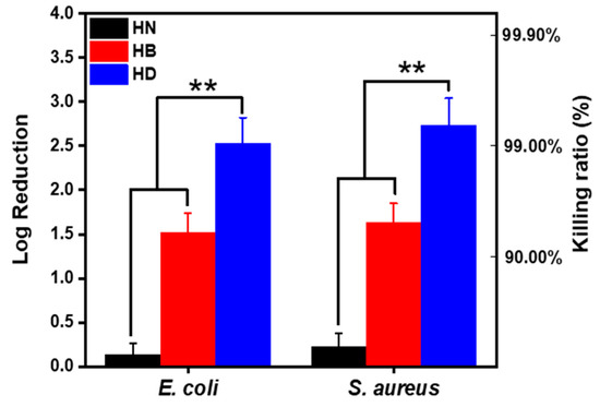 The antibacterial activities of the prepared injectable hydrogels (HB and HD) containing imidazolium PILs are shown in Figure 4. Both HB and HD exhibited antibacterial activities against E. coli and S. aureus. HD could reduce the amount of E. coli by a 2.51 log reduction (sterilization rate = 99.5%) and S. aureus by a 2.64 log reduction (sterilization rate = 99.7%), in both cases more effectively than that of HB (reducing the amount of E. coli by a 1.5 log reduction for (sterilization rate = 95.5%) and S. aureus by a 1.6 log reduction (sterilization rate = 96.4%)). That was because the zeta potential of PDP (8.5 mV) was higher than that of PBP (6.9 mV). The more positive charge imidazolium groups on the polymer chains, the better disruption of the bacteria cell wall [38]. This result was also consistent with minimum inhibitory concentrations (MICs) of HB and HD in Table S2.