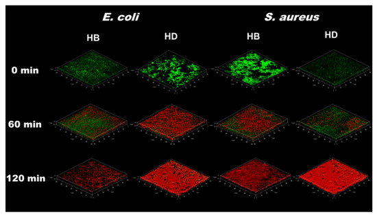 Fluorescence images of biofilms stained with LIVE/DEAD stain after treating with HB and HD in 0 min, 60 min and 120 min.