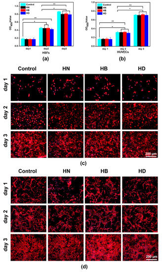 Cell viability and morphology when cultured on injectable hydrogels: (a) cell viability of HUVECs at day 1, day 2 and day 3; (b) cell viability of HSFs at day 1, day 2 and day 3; (c) cell morphology of HUVECs at day 1, day 2 and day 3; (d) cell morphology of HSFs at day 1, day 2 and day 3; the scale bars are 200 μm (n = 4, * means p ≤ 0.5, ** means p ≤ 0.01).