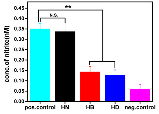 According to the results of Griess assay (Figure 8), HB and HD had ability to suppress nitric oxide (NO) production activated by LPS. This demonstrated that PILs in the hydrogels had therapeutic efficacy. This is because LPS is a component of the outer cell wall of Gram-negative bacteria and PILs could kill E. coli effectively, thereby reducing the production of NO in U-937 cells induced by LPS [47]. More importantly, through the LPS inflammation model [48,49], we observed that the prepared injectable hydrogels containing PILs could quickly destroy their antibiofilm activity within 2 h, thereby preventing the inflammatory reaction to a certain extent.