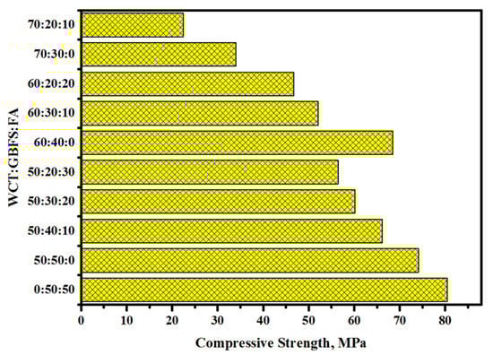 Figure 1 shows the CS of the GPMs as a function of various WCT contents at 28 days of curing. Compared to the control sample (GPM1), the inclusion of 50% of WCT in place of FA in the GPMs was found to reduce their CS from 80.5 to 74.1 MPa. In addition, the CS of GPMs varied inversely with increase in WCT contents from 50 to 70%, wherein the values of CS were reduced from 70.1 to 34.8 MPa, respectively. The observed reduction in the mortars’ CS was mainly ascribed to the low calcium and high silica contents [10,43,44], which led to the formation of little C-(A)-S-H gels, thus lowering the CS. It is worth noting that WCT contained over 70% silica with larger grain size (35 µm) compared to GBFS and FA, which significantly affected the CS of GPMs designed with a high volume of WCT. GPMs made from a high volume of WCT attained a CS of 81% at 28 days of age. With increasing FA level in GPMs the amounts of silica and aluminum increased, which negatively influenced the calcium level (Ttableable 1). With the decrease in GBFS level from 50% (GPMs2) to 20% (GPMs10) the CS of GPMs was reduced from 70.1 to 22.4 MPa, respectively at 28 days of age, which was mainly due to less Ca and Al content that led to the formation of little C-(A)-S-H gels. This result was consistent with Rashad’s [45] work, wherein the CS of GPMs was found to decrease with the increase on fly ash content. This lowering in the mortars’ CS can be attributed to many factors: first, the dissimilarity in the chemical constituents of WCT, slag, and fly ash that appreciably influenced the binders’ alkali activation processes; second, the lower reaction rate of WCT and FA compared to GBFS, wherein GBFS was dissolved partially [46]; third, lower compactness and density of GPMs matrix at a higher level of WCT and FA incorporation; fourth, alkaline activator low molarity (2 M) in which the CS primarily depended on the calcium oxide concentration that replaced the low quantity of sodium oxide. Eventually, the generation of a high amount of N-A-S-H, C-S-H, and C-A-S-H gels led to the CS enhancement of the proposed GPMs.