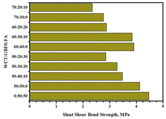 Figure 2 displays the WCT:GBFS:FA proportion-dependent SSBS of the studied GPMs at a curing age of 28 days. The GPM composite cylinder’s bond strength decreased from 4.47 MPa (control sample) to 4.13 MPa with the increase in WCT level from 0 to 50% as the FA replacement, respectively. The NC substrate and 30° slant shear load carrying capacity of GPMs at 28 days of curing age dropped from 4.17 to 2.77 MPa with the increase in WCT content from 50 to 70%, respectively. Mixes having higher levels of GBFS or containing GBFS and FA only (GPMs1) showed much higher SSBS that mix designed with 70% of WCT. This clearly suggested that GPMs consisting of high levels of GBFS could generate more C-(A)-S-H gels compared to those prepared with lower levels of GBFS. The observed findings were ascribed to the low silicate levels and non-reactive properties of GPMs. The bond strength of the ternary blended GPMs was significantly enhanced as GBFS was increasingly substituted by WCT and FA, thus making the mortars more reactive. In addition, the low CaO content and reduction in N,C-A-S-H gels formation [47] was responsible for the reduced bond strength of WCT-based GPMs. With the failure zone emerging outside the bond zone [48], the 30° SSBS result for the GPMs was the key finding in this study.