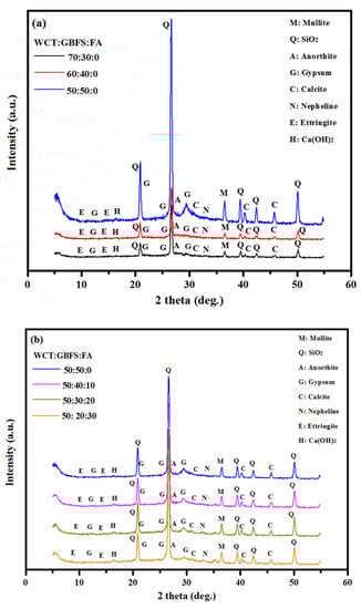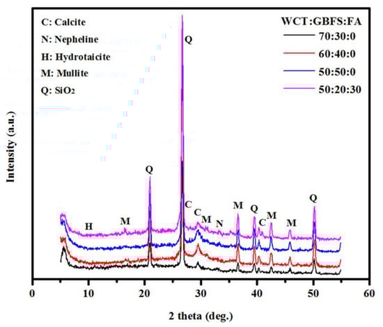 Effects of various WCT:GBFS:FA on the XRD patterns of GPMs.