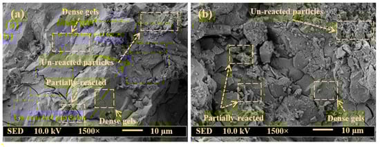 Figure 4 shows the SEM results of GPMs prepared with various WCT:GBFS:FA contents at 28 days of age. GPMs designed with 50 and 70% of WCT (GPMs2 and GPMs9) were imaged using SEM. GPMs containing 50% of WCT revealed dense structure with a low quantity of non-reacted and partially reacted particles. Furthermore, GPM containing 70% of WCT showed a higher amount of non-reacted and partially reacted particles (Figure 4b) than the one designed with 50% of WCT (Figure 4a). A higher amount of highly porous and non-reacted silica with poor morphologies was formed with the increase in WCT contents. Consequently, the SSBS of GPMs was reduced to 2.77 MPa at 70% of WCTand 4.13 MPa at 50% of WCT.