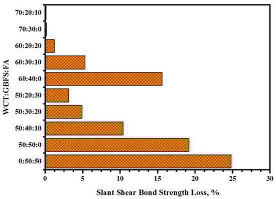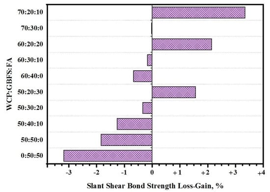 The loss in SSBS of the cylindrical GPMs–NC specimens containing a high volume of WCT was measured to assess the specimens’ performance in an MgSO4 environment (Figure 9). In general, all GPMs prepared with a high volume of WCT displayed excellent resistance compared to those containing higher GBFS. With the increase in WCT content in the geopolymer matrix from 50 to 70% as the replacement to GBFS, the SSBS dropped from 3.18 to 0.02%, respectively. In each level of high volume WCT geopolymer, the replaced GBFS by FA has positively affects residual slant shear bond strength, and loss bond strength decreased with increased FA content. When GBFS was replaced by WCT at 50, 60, and 70% in the geopolymer matrices, the resistance of the GPMs against sulfate environment was improved. GPMs prepared with a high level of WCT and FA as GBFS displayed very high resistance and showed a gain in the SSBS between 1.56 and 3.34%. In addition, the deterioration of the GPMs’ surface was lowered with the increase in WCT and FA contents. Most of the reports argued that sulfate attack could lead to the formation of expansive ettringite and gypsum, accompanied by the expansion or softening of geopolymer composite specimens. Consequently, with the decrease in GBFS content in the binder matrix, the Ca+2 content dropped with lower CaSO4 product, improving the GPMs’ resistance against sulfate attack. Additionally, the loss slant shear bond strength with decreased FA as GBFS replacement in a high-volume WCT matrix occurred because of same reason, as the GBFS replaced by FA decreased the content of calcium and led to more internal deterioration because of CaSO4 formulation and expansion. It was concluded that all GPMs–NC composite specimens displayed excellent performance in sulfate environments. However, no deterioration was observed on all surfaces of GPMs specimens containing a high amount of WCT and FA and exposed to sulfate attack.