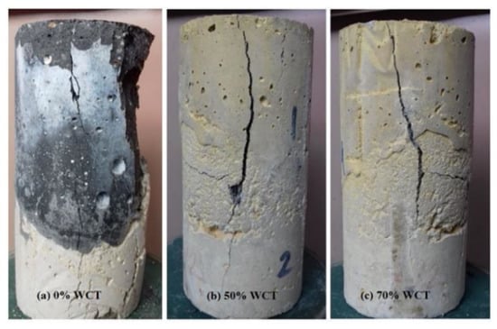 The residual bond strength of the GPMs was enhanced when a high amount of WCT and FA in place of GBFS was incorporated in the geopolymer matrix. Additionally, the deterioration of the GPMs’ surface was restricted with the increase in WCT content (Figure 4). This observation was attributed to the formation of expansive ettringite and gypsum due to sulfuric acid attack. It may be accompanied by the expansion or softening of geopolymer mortars in which an increase in WCT level led to reducing the Ca+2 content within the geopolymer matrix with a lower CaSO4 product. Furthermore, the loss of bond strength with the increase in WCT to FA ratio in the geopolymer matrix occurred. The same observation was made when WCT and FA increasingly replaced GBFS, which reduced the calcium content (Table 1) and led to less internal deterioration because of lower CaSO4 formulation and expansion. The surface deterioration and crack formation were reduced with the increase in WCT content. Upon exposing the GPMs to acid, the calcium hydroxide compound present in GPM specimens could react with SO4−2 ion, forming gypsum (CaSO4·2H2O). This led to the expansion of the GPM matrix, and additional cracks were developed inside the specimens, as observed through visual appearance inspection (Figure 6). Many reports [49,50,51,52] revealed that due to the increase in SiO2, Al2O3, and Na2O contents, the gypsum formation was reduced, thus increasing the durability of GPMs.