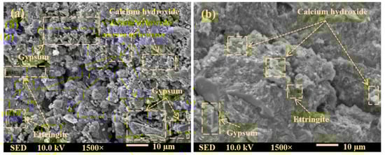 Figure 8 displays the effect of the H2SO4 solution environment on the surface morphology of GPMs. The performance of GPMs after immersion in 10% of H2SO4 solution for a period of 360 days was evaluated. The results indicated that, with increasing WCT content as GBFS replacement in the GPMs, the gypsum and internal cracks were reduced, lowering the deterioration. GPMs containing 50% of GBFS (Figure 8a) showed a higher amount of gypsum and ettringite with more cracks and porous morphology than those prepared with 70% WCT as GBFS replacement. It was demonstrated that [54] a reduction in the calcium content and controlled gypsum formulation in the GPMs and cement matrix was responsible for the enhancement in the binder performance when exposed to a sulfuric acid environment.