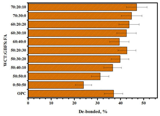 Effects of various WCT:GBFS:FA on the de-bonded percentage of the prepared GPMs.