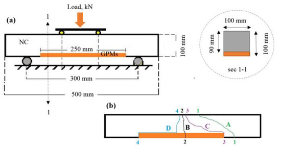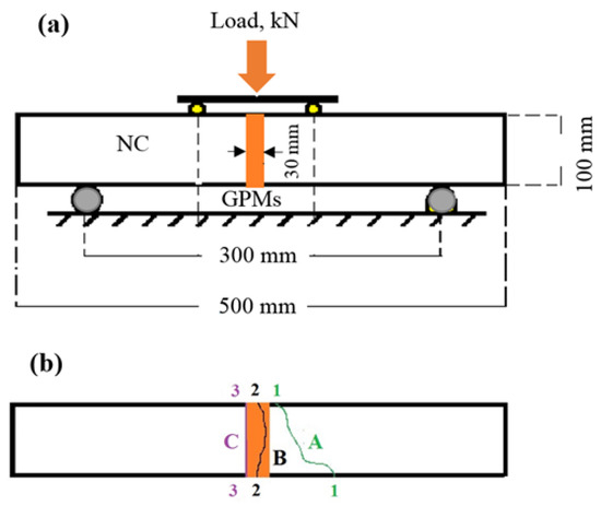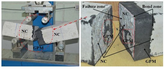 Two key procedures were applied to test the concrete substrate and compatibility between the GPMs. In the first test (ASTM C78 standard), GPMs were poured to the depression generated at the bottom of a prism-shaped concrete piece (dimensions 250 mm × 100 mm × 10 mm) as shown in Figure 19a. At 28 days of curing, the concrete substrate showed the strength of 43.6 MPa. The filled side of the GPMs was placed at the specimens’ bottom in this test. In test 2, the vertical shear bonding strength (SBS) between GPMs and NC (dimensions 100 mm × 100 mm × 30 mm) was determined (Figure 20a). Prism shaped specimens with 40 MPa grade (C40) were cast (dimension of 100 mm × 100 mm × 500 mm). First the specimens were cut at the middle to the required dimension and then put into the prism molds to pour the fresh GPMs. A four-point load (at a rate of 0.2 kN/s) was then deployed to test the samples after 28 days of curing. The failure mode was used to evaluate the compatibility of the repair materials and the concrete substrate. Once the failure passed through the concrete substrate and repair material at the middle third of the prism, the GPMs were likely to have adequate compatibility. When the GPMs did not meet this requisite, they were declared incompatible. Figure 19b and Figure 20b display the failure zone types at the bonding stresses of the composite beam and the four-point loading. The OPC mortar was used as a comparator (cement to sand ratio of 1:3, water: cement ratio of 0.48 and CS of 34.1 MPa after 28 days of curing). The compatibility between the NC and GPMs was measured in terms of the TCE, bending stress, and four-point loading flexural strength.