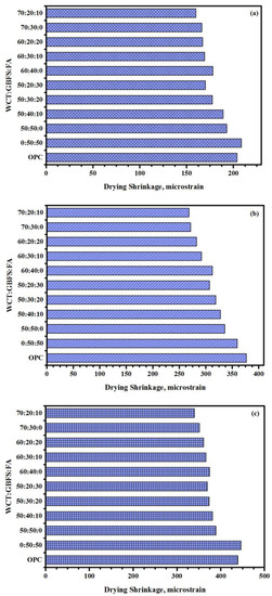 At 28 days (Figure 14b) and 180 days (Figure 14c) of curing age, the drying shrinkage of GPMs displayed a similar decreasing trend with the increase of WCT content as a GBFS replacement. All the designed GPMs specimens containing WCT showed lower drying shrinkage than the one obtained for OPC-based NC. Previous studies indicated that the drying shrinkage characteristics of the alkali-activated geopolymer composites are more complicated than OPC composites due to their complex hydration and shrinkage mechanisms [55,56,57]. Among these geopolymer binders, the shrinkage problem of GBFS-based geopolymer systems is particularly prominent, which is significantly higher compared to other geopolymer composites (such as FA, metakaolin, and coal gangue) [56]. Some reports indicated that the partial replacement of GBFS by FA can effectively alleviate the shrinkage of the GPMs systems but weaken their strength development [22,32,54,55]. Therefore, the selection of suitable proportions of the mineral admixtures is very important to optimize the performance of GPMs. It was shown that the inclusion of FA can enable the formation of some 3D networked N-A-S-H gels, restraining the shrinkage of C-A-S-H gels [58]. According to Humad et al. [59], the addition of FA in the AAS mixture can significantly mitigate its autogenous shrinkage without exhibiting considerable effects on its drying shrinkage. So far, only a few studies have suggested that the incorporation of FA in the geopolymer matrix can enhance the shrinkage of GPMs [55]. The effects of FA addition on the drying shrinkage were attributed mainly to the increased porosity and reduced tortuosity of GPMs [58,60,61].