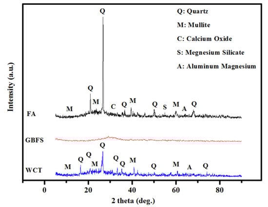 Figure 15 illustrates the X-ray diffraction (XRD) profiles of WCT, GBFS, and FA powder, which consisted of intense peaks at 2θ rage of 16–30°. These peaks were allocated to the existence of silica and alumina crystallites. Occurrences of other sharp peaks were assigned to the existence of quartz and mullite crystallites. Many reports [62,63,64] claimed that the glassy nature of WCT and FA are vital for the hydration reaction and formation of gels. The absence of a sharp XRD peak of GBFS indeed confirmed their true disordered nature. The occurrences of silica and calcium peaks in the XRD pattern were significant towards GBFS creation. The presence of high content of reacting amorphous silica and calcium oxides in slag was advantageous for GPMs synthesis. However, the inclusion of fly ash was essential to surmount the low level of Al2O3 (10.49 wt.%) in slag.