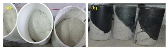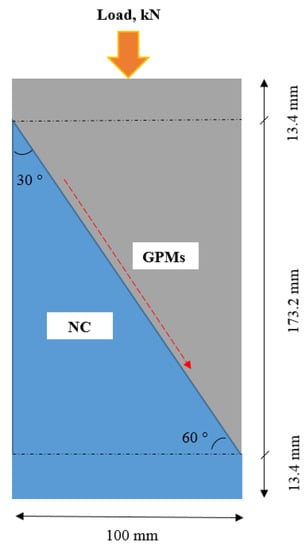 Following to ASTM C109 [69], the compressive strength of GPMs specimens with various ratios of WCT:GBFS:FA were evaluated at 28 days of curing. The average value of the tested three specimens was considered for each mixture. For all the GPM specimens (50 mm × 50 mm × 50 mm), the consistent loading rate (2.5 kN/second) was applied using a compression strength machine. For the slant share bond strength (SSBS) test of the hardened NC, it was diagonally positioned at a 30° inclination from the vertical, and the bond strength between GPMs and the concrete substrate was measured. A closer minimum stress with bond angle of 30° constituted the failure stress point accordant with a smooth surface following to ASTM C882. The typical procedure of the SSBS test was presented in Figure 16. The NC specimens were created utilizing the aged shear concrete cylinders at the 30° inclination. The SSBS evaluation was performed on the saw cut concrete surface. The conventional concrete was placed half-slanted into the cylinder mold, and the fresh GPMs were filled in the cylinder mold (Figure 17). The CS test was carried out after 28 days of curing where a compression machine was used to conduct this test.