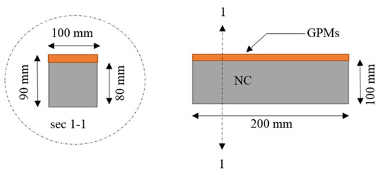 During the GPMs mixing, total river sand was placed in the mixer, followed by the addition of 50% of binary/ternary blended (FA, GBFS, and WCT). The materials were mixed in dry conditions for three minutes to create a homogenous mixture before adding the second batch of binder (50%). After including the second batch of binder, the materials were mixed for another two minutes with normal speed. Finally, the mixed materials (river sand and binders) were activated with the prepared alkaline activator solution (sodium silicate and sodium hydroxide). After a further three minutes of mixing, the final mixture was poured in the molds. The casted specimens were left for one-day curing at room temperature (26 °C) and relative humidity of 75%. Later, the cured GPM specimens were de-molded and left in the same condition of curing until the day of test. For the concrete substrates (NC), the ordinary Portland cement (OPC) was used to manufacture the NC with compressive strength up to 40 MPa. In the trial mixture, the OPC to river sand to crushed stone proportion was 1:1.5:3.0 and 0.48 was the water to OPC ratio. The strength properties of NC specimens were evaluated at 28 days of curing. The tested specimens displayed 43.61 MPa compressive strength (CS), 5.61 MPa flexural strength (FS), 4.43 MPa splitting tensile strength (STS), and 28.21 GPa modulus of elasticity (MoE).